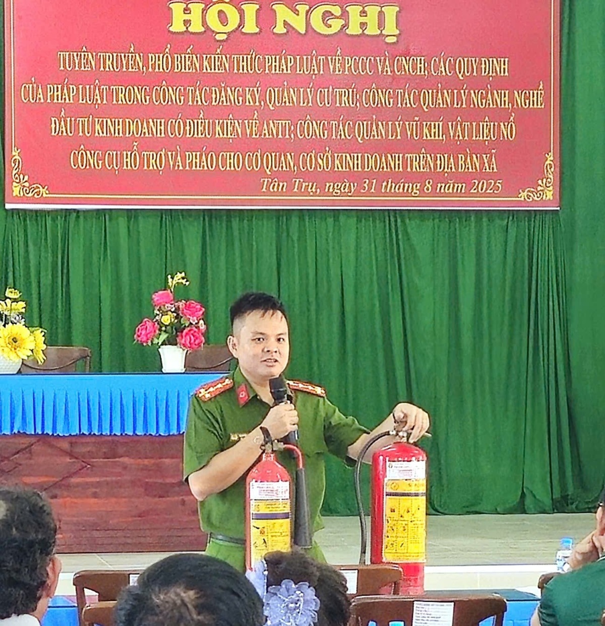 Thực hiện cao điểm tấn công, trấn áp tội phạm, bảo đảm an ninh trật tự Đại hội Đảng các cấp, tiến tới Đại hội đại biểu toàn quốc lần thứ XIV của Đảng và các hoạt động Kỷ niệm 80 năm Cách mạng tháng Tám, Quốc khánh nước Cộng hòa xã hội chủ nghĩa Việt Nam, Công an xã Tân Trụ tổ chức Hội nghị tuyên truyền, phổ biến kiến thức pháp luật về phòng cháy chữa cháy (PCCC), quản lý cư trú;quản lý ngành nghề đầu tư kinh doanh có điều kiện về an ninh, trật tự; quản lý, sử dụng vũ khí, vật liệu nổ, công cụ hỗ trợ và pháo cho 100 cá nhân đại diện doanh nghiệp, cơ sở kinh doanh trên địa bàn xã.