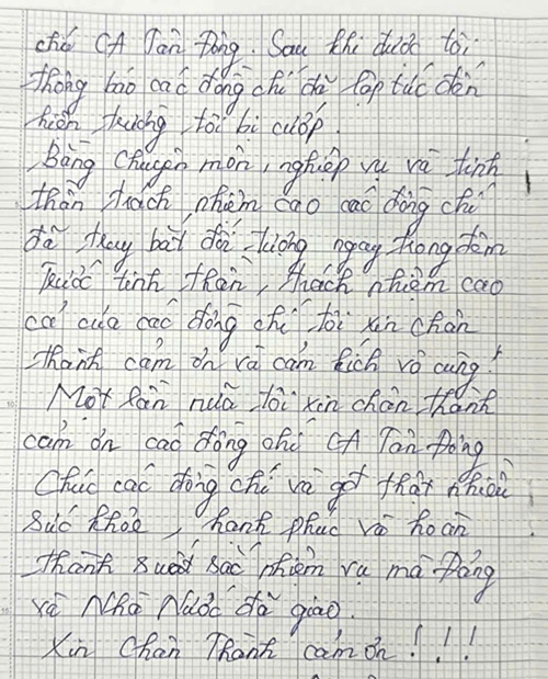 Xúc động trước sự vào cuộc nhanh chóng và truy bắt được đối tượng cướp tài sản của lực lượng Công an, chị N đã gửi thư cảm ơn đến Công an xã Tân Đông. Thư cảm ơn chân thành của chị N đã tiếp thêm động lực cho Công an xã Tân Đông hoàn thành tốt nhiệm vụ giữ gìn an ninh trật tự tại địa phương./.
