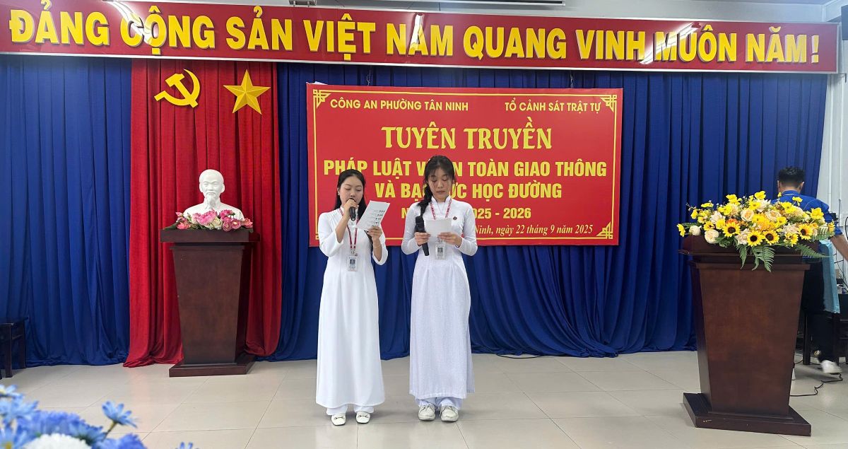 Ngày 22/9/2025, Công an phường Tân Ninh phối hợp Phòng Cảnh sát giao thông Công an tỉnh Tây Ninh tổ chức tuyên truyền, phổ biến pháp luật về an toàn giao thông và bạo lực học đường cho hơn 100 em học sinh Trường THPT Chuyên Hoàng Lê Kha.