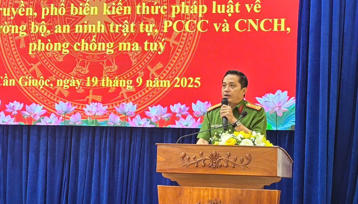 Công an xã Cần Giuộc, tỉnh Tây Ninh tổ chức Hội nghị tuyên truyền, phổ biến kiến thức pháp luật cho 150 đại biểu là trưởng các ấp, khu phố, chủ cơ sở kinh doanh cho thuê lưu trú trên địa bàn xã.