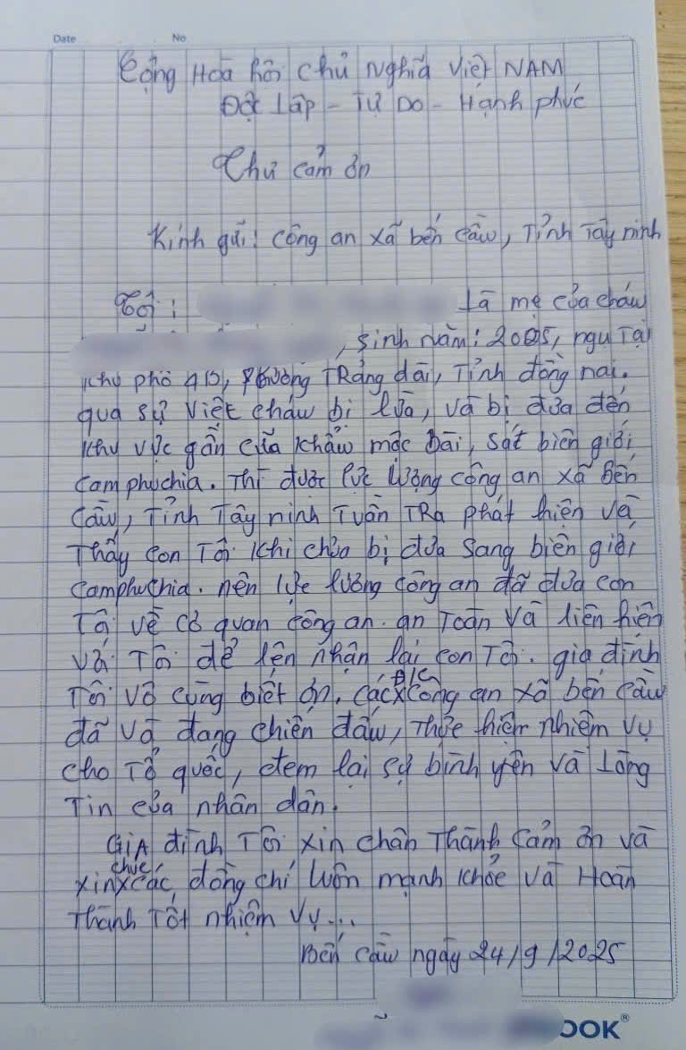 Đơn cử, khoảng 23 giờ ngày 23/9/2025, Công an xã Bến Cầu tuần tra khu vực ấp Chánh phát hiện N.T.P (SN 2005), ngụ phường Trảng Dài, tỉnh Đồng Nai, mang vali hành lý ở khu vực biên giới có biểu hiện nghi vấn nên mời về trụ sở làm việc. Qua xác minh được biết, trước đó vào ngày 21/9/2025, P lên Facebook tìm việc, được các đối tượng (chưa rõ lai lịch) hứa đưa sang Campuchia làm việc với mức lương 900 USD/tháng. Đến tối ngày 23/9, P thuê xe ô tô chở đến cửa khẩu Mộc Bài chờ xuất cảnh trái phép thì bị công an xã phát hiện ngăn chặn kịp thời. Sau khi được Công an xã giải thích, P mới biết mình đã bị lừa. Gia đình P. sau khi biết được sự việc đã vô cùng cảm kích, viết thư cảm ơn Công an xã Bến Cầu đã kịp thời giải cứu con mình.