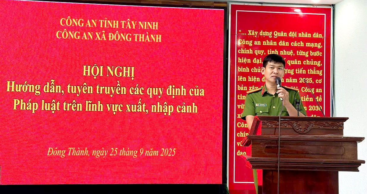 Ngày 25/9/2025, Công an xã Đông Thành tổ chức Hội nghị tuyên truyền, phổ biến các quy định của pháp luật trong lĩnh vực xuất, nhập cảnh cho quần chúng nhân dân trên địa bàn xã.