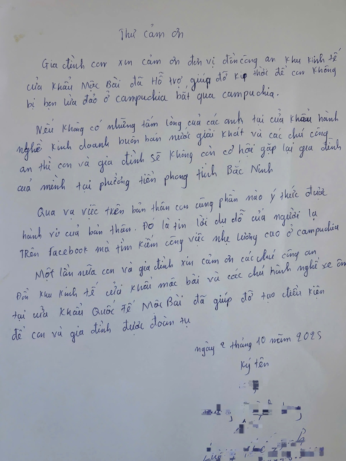 Ngay sau đó, Đồn Công an Khu kinh tế cửa khẩu Mộc Bài phối hợp Công an an xã Bến Cầu, tỉnh Tây Ninh cử tổ công tác nhanh chóng có mặt, đưa thiếu niên về trụ sở để xác minh. Qua làm việc, xác định em là L.T.L., sinh ngày 27/01/2010, ngụ phường Tiền Phong, tỉnh Bắc Ninh. Đồn Công an KKTCK Mộc Bài lập tức liên hệ với gia đình. Đến sáng ngày 02/10/2025, người thân của em L. có mặt tại đơn vị và đưa em trở về nhà an toàn. Sau đó, gia đình em L. gửi thư cảm ơn lực lượng Công an vì sự kịp thời phối hợp, giúp em thoát khỏi cạm bẫy của tội phạm dụ dỗ lao động trái phép.