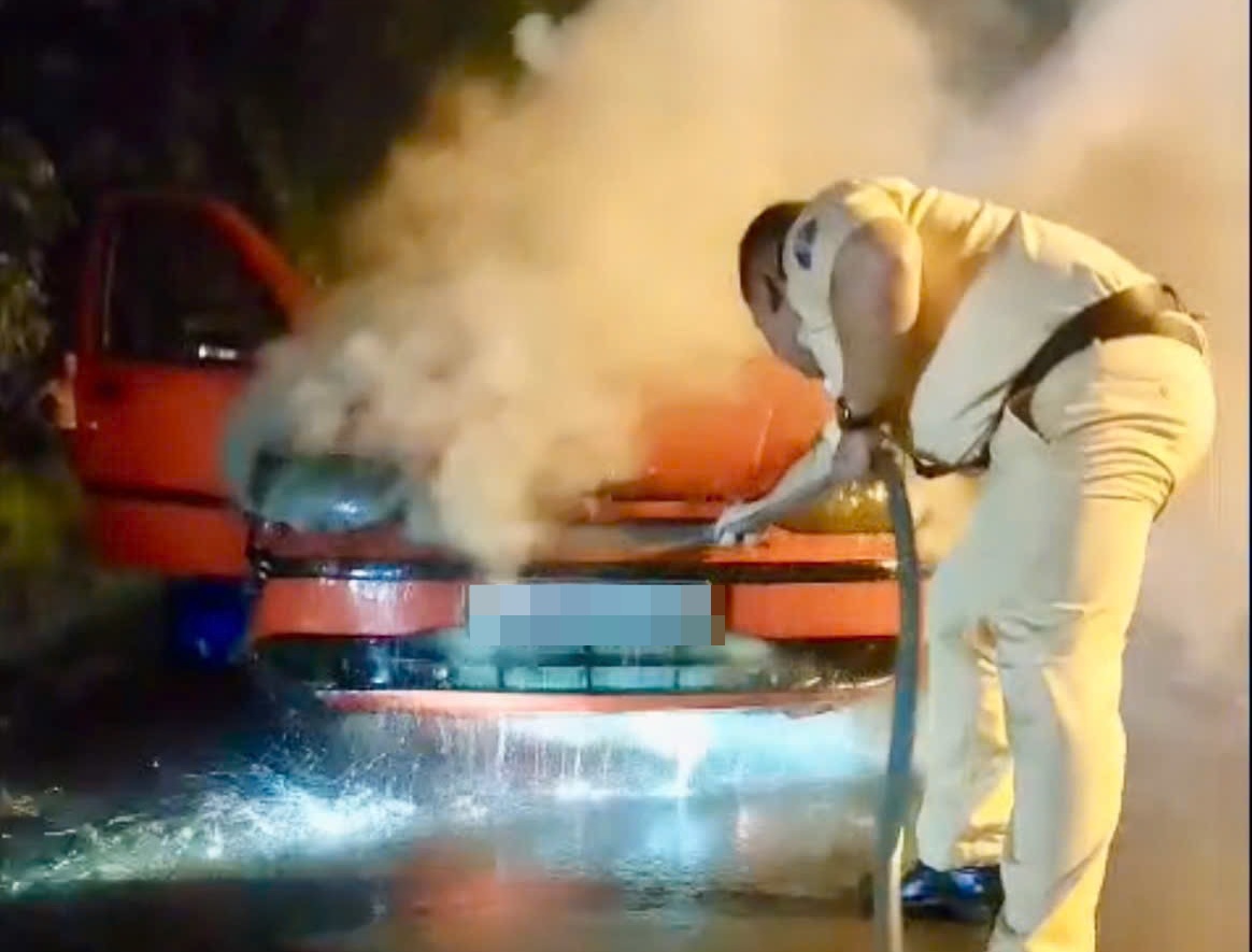 CSGT hỗ trợ chữa cháy xe cho người dân.