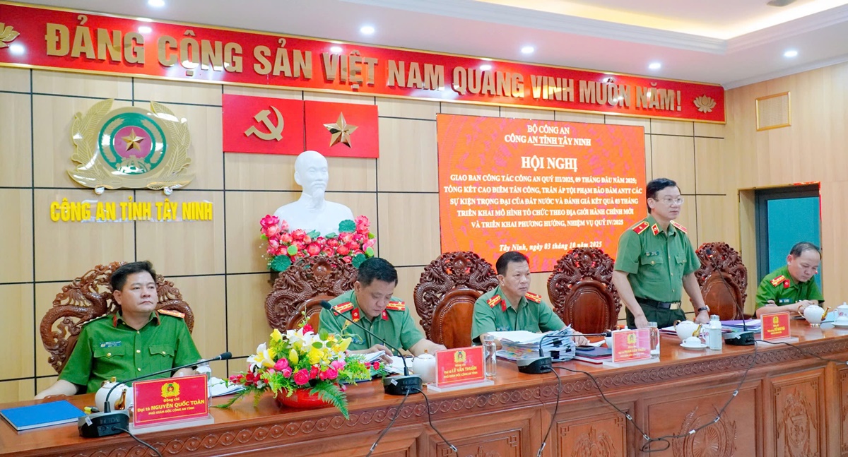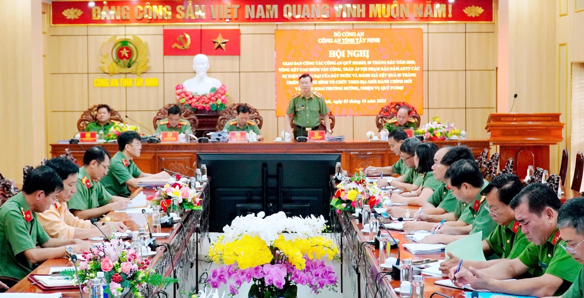 Sáng nay (03/10/2025), Công an tỉnh Tây Ninh tổ chức Hội nghị giao ban công tác Công an Quý III, 09 tháng đầu năm 2025; tổng kết cao điểm tấn công, trấn áp tội phạm bảo đảm ANTT các sự kiện trọng đại của đất nước và đánh giá kết quả 03 tháng triển khai mô hình tổ chức theo địa giới hành chính mới. Thiếu tướng Vũ Như Hà - Ủy viên Ban Thường vụ Tỉnh ủy, Bí thư Đảng ủy, Giám đốc Công an tỉnh chủ trì Hội nghị.