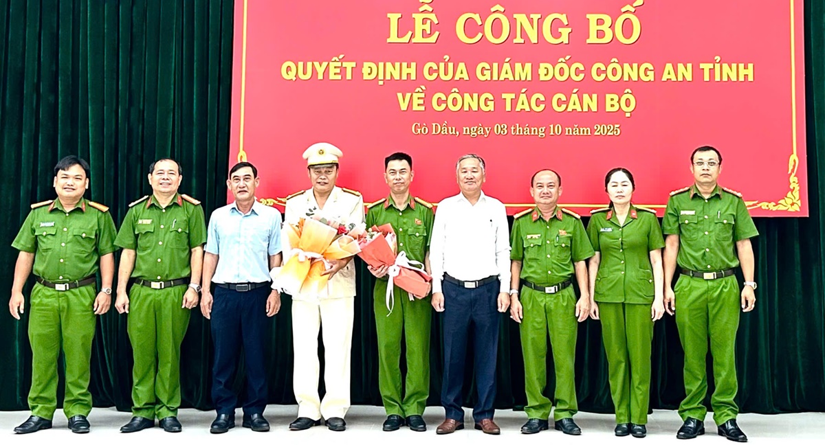 Ngày 03/10/2025, Công an phường Gò Dầu tổ chức Lễ công bố Quyết định của Giám đốc Công an tỉnh về công tác cán bộ. Tham dự buổi lễ có đồng chí Trịnh Ngọc Phương - Bí thư Đảng ủy phường; đồng chí Nguyễn Thanh Hải - Phó Bí thư Đảng ủy, Chủ tịch UBND phường; Tổ trưởng các tổ bảo vệ an ninh cơ sở cùng toàn thể cán bộ, chiến sỹ Công an phường.