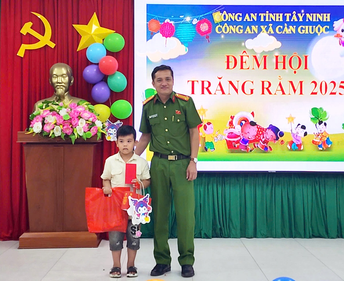 Tặng quà cho em Phan Gia Huy trong mô hình "Con nuôi Công an xã" nhân dịp tết Trung thu 2025.