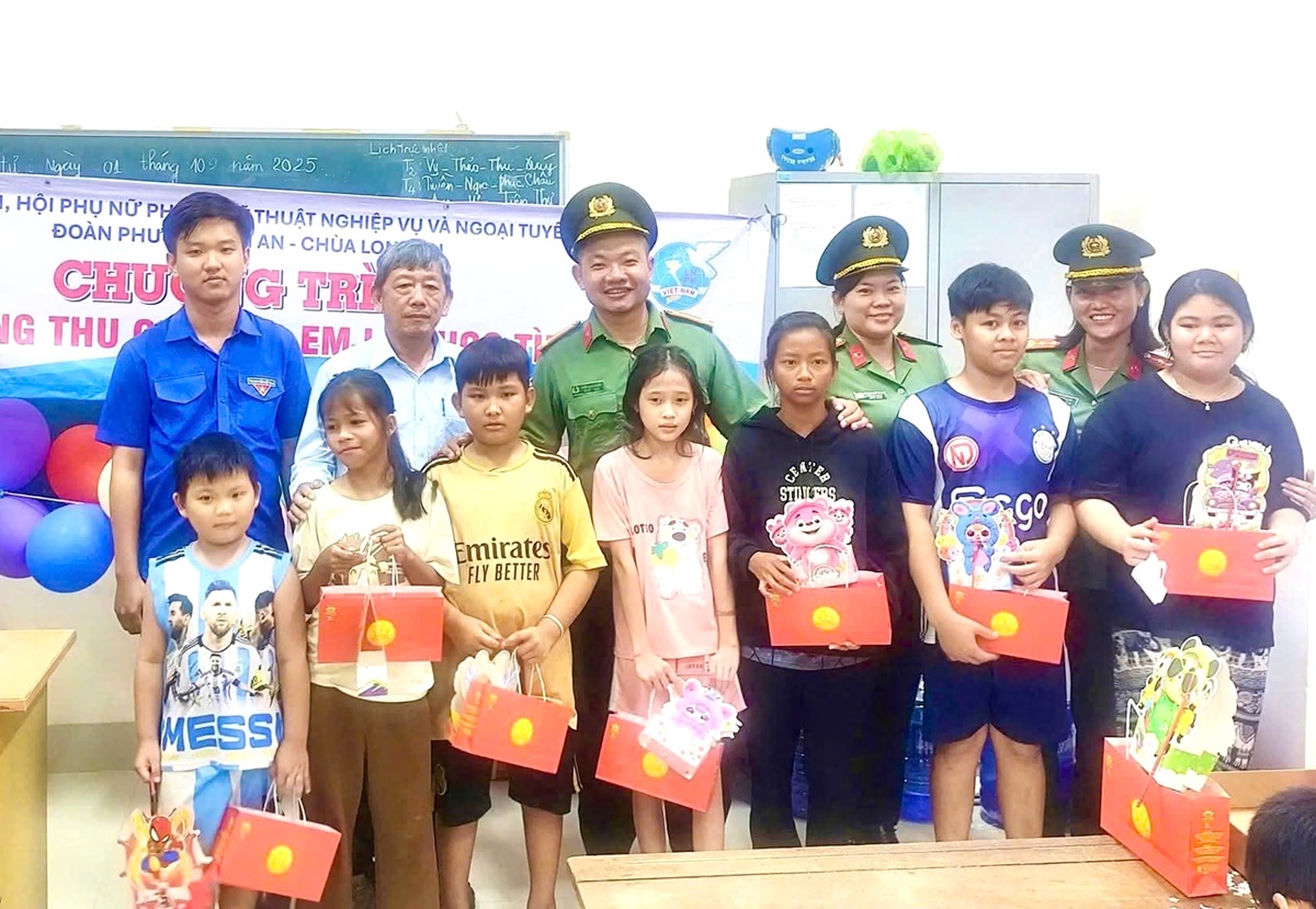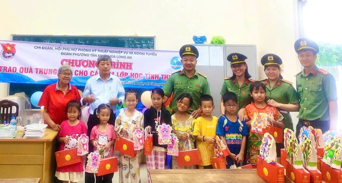 Chi đoàn - Hội Phụ nữ cơ sở Phòng Kỹ thuật nghiệp vụ và ngoại tuyến phối hợp với Đoàn phường Tân An và mạnh thường quân tổ chức trao quà trung thu cho các em thiếu nhi Lớp học tình thương trên địa bàn phường Long An, tỉnh Tây Ninh.