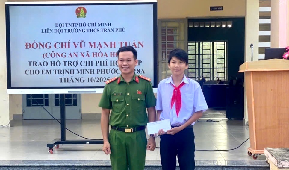 Nhân dịp, Đại úy Vũ Mạnh Tuấn trao phần quà hỗ trợ chi phí học tập hằng tháng cho em Trịnh Minh Phước, học sinh có hoàn cảnh khó khăn, trong học tập. Đây là hoạt động hỗ trợ thường xuyên được đồng chí Tuấn duy trì từ đầu năm học 2024 - 2025 đến nay, nhằm chia sẻ khó khăn, động viên tinh thần học tập cho học sinh nghèo vượt khó trên địa bàn xã Hòa Hội.