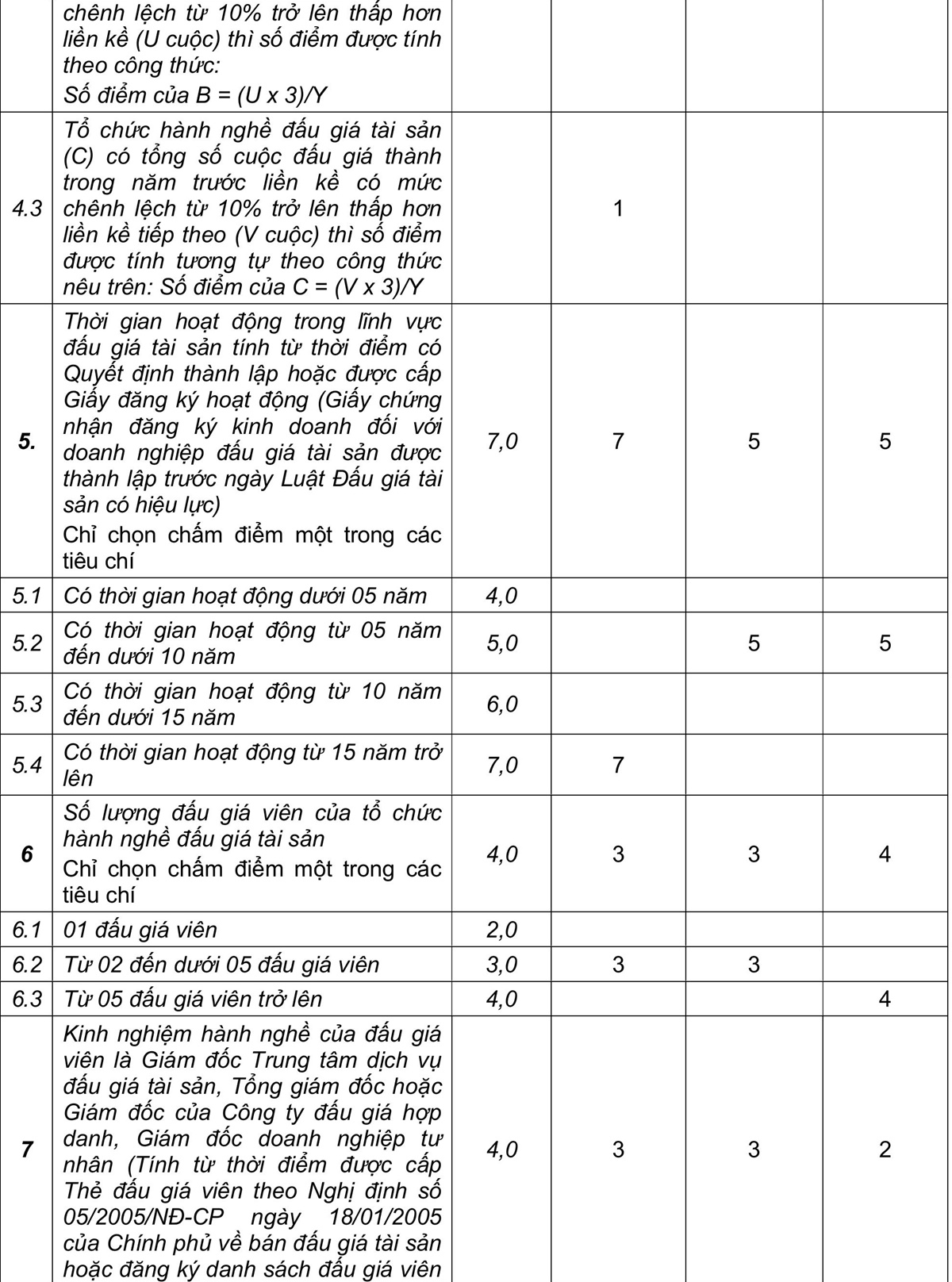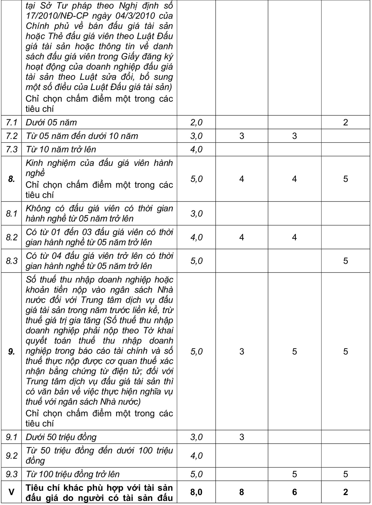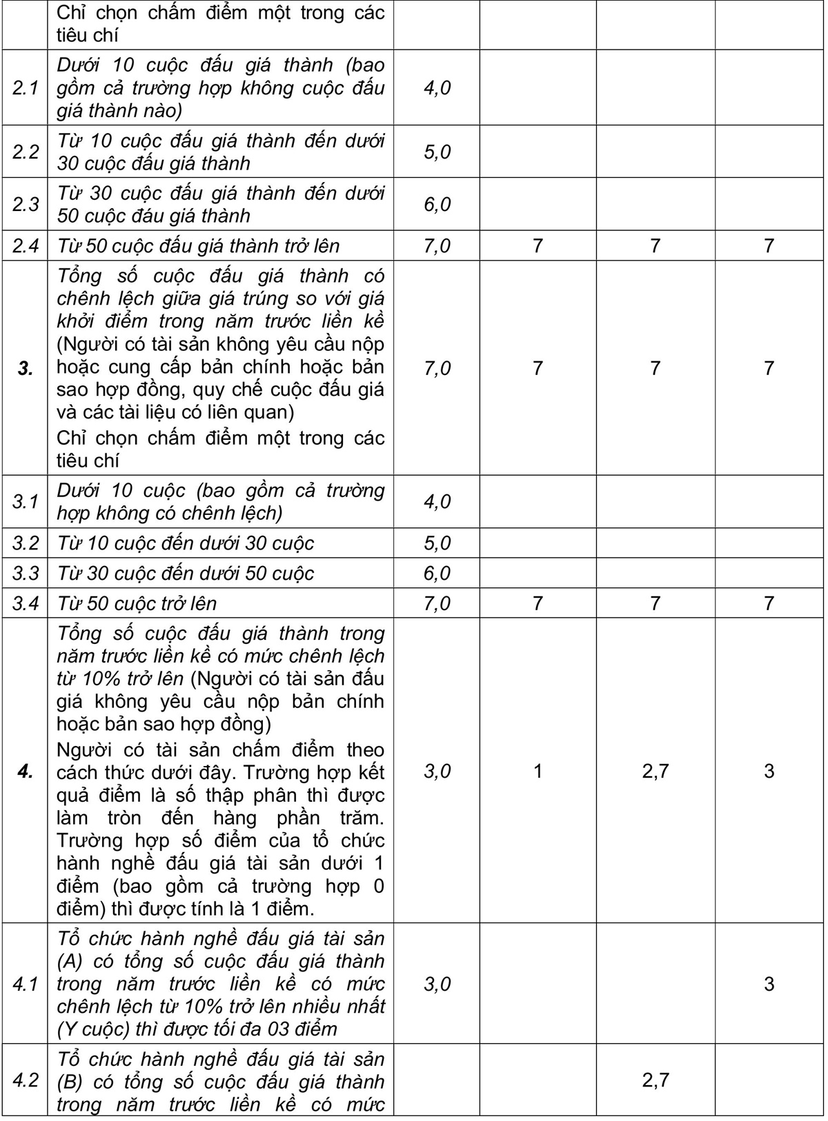 4. Tổ chức hành nghề đấu giá tài sản không được đánh giá, chấm điểm kèm theo lý do (nếu có): Không.