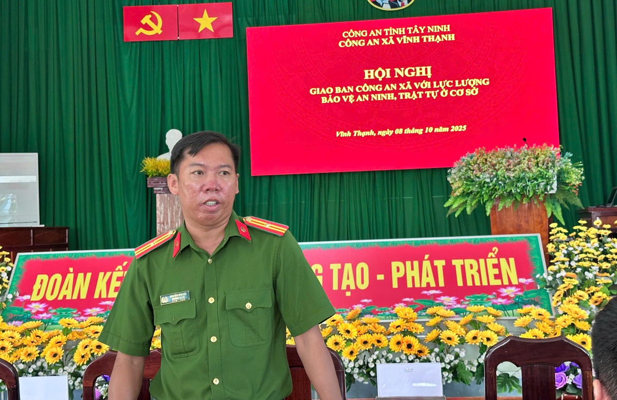 Phát biểu tại Hội nghị, Thiếu tá Nguyễn Văn Cải - Trưởng Công an xã giải đáp các thắc mắc, kiến nghị, đề xuất của các đồng chí Tổ trưởng Tổ ANTT cơ sở; quán triệt tinh thần đoàn kết, nêu cao trách nhiệm, phối hợp chặt chẽ, hoàn thành tốt nhiệm vụ bảo vệ ANTT trên địa bàn. Đồng thời, yêu cầu các lực lượng tiếp tục duy trì công tác nắm tình hình, kịp thời tham mưu, xử lý các vụ việc phát sinh, góp phần giữ vững an ninh, trật tự, tạo môi trường an toàn, ổn định phục vụ phát triển kinh tế - xã hội địa phương; trọng tâm là triển khai công tác bảo đảm an ninh, trật tự Đại hội đại biểu Đảng bộ tỉnh Tây Ninh lần thứ I, nhiệm kỳ 2025 - 2030./.