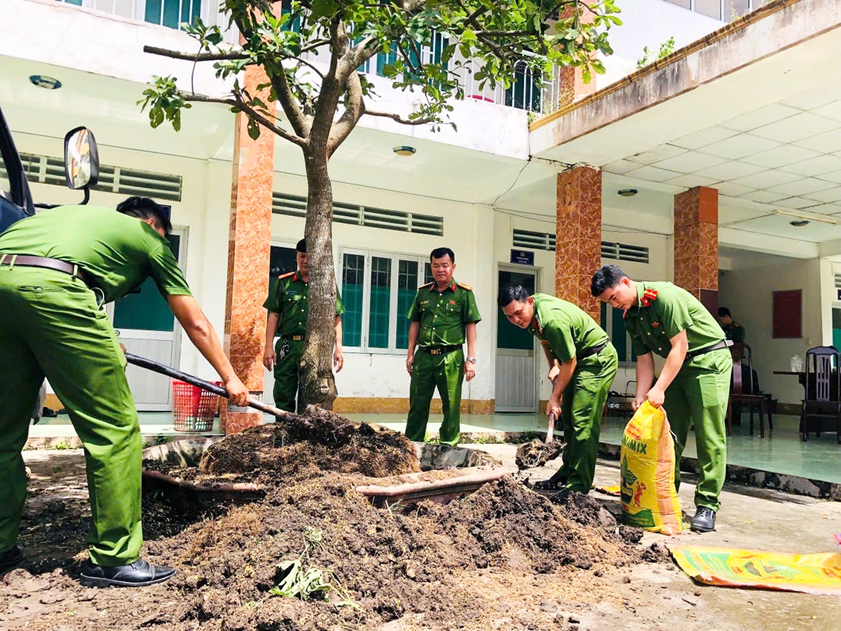 Cán bộ chiến sỹ Công an xã Đông Thành trồng cây xanh thực hiện công trình.
