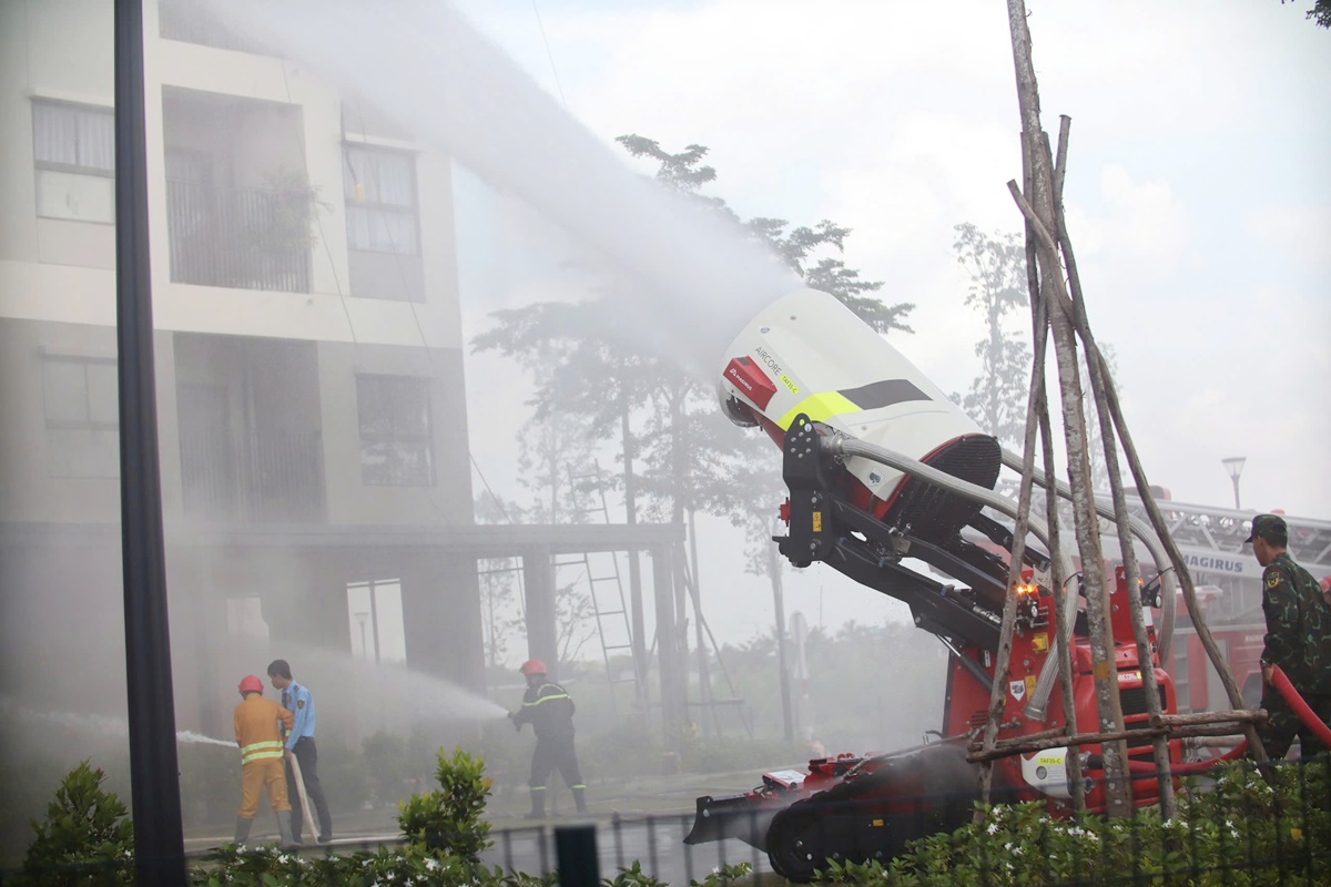 Hình ảnh robot chữa cháy tham gia diễn tập phương án chữa cháy và cứu nạn, cứu hộ có huy động nhiều lực lượng, phương tiện tham gia tại Tòa nhà A4 Chung cư Ehome Southgate.