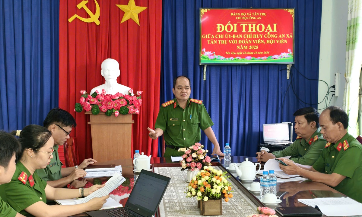 Quang cảnh buổi đối thoại giữa cấp ủy với đoàn viên, hội viên của Công an xã Tân Trụ.
