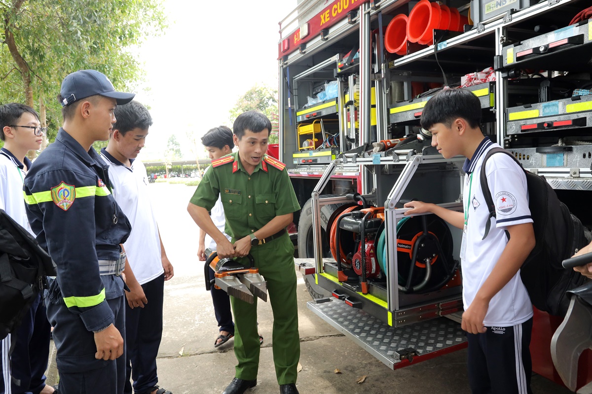 Các em học sinh hào hứng tham quan, nghe giới thiệu về các phương tiện, trang thiết bị chữa cháy, CNCH như xe chữa cháy, mặt nạ phòng độc, một số trang thiết bị phục vụ công tác chữa cháy, xe CNCH, dụng cụ banh cắt thường sử dụng trong xử lý tai nạn, sự cố. Ngoài ra, các em còn được xem trình diễn xe thang trong công tác chữa cháy, CNCH nhà cao tầng; tích cực tham gia giao lưu, trả lời nhanh các câu hỏi xoay quanh kiến thức, kỹ năng PCCC, CNCH và nhận những phần quà ý nghĩa.