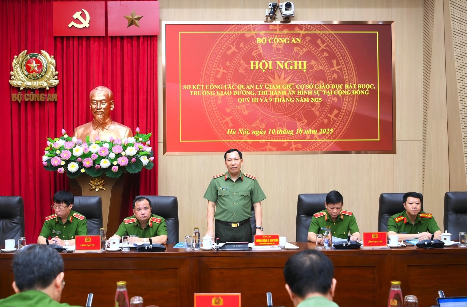 Sáng 10/10/2025, tại Hà Nội, Thượng tướng Lê Văn Tuyến - Thứ trưởng Bộ Công an chủ trì Hội nghị giao ban công tác giam giữ, cơ sở giáo dục bắt buộc, trường giáo dưỡng và thi hành án hình sự tại cộng đồng Quý III/2025 và 9 tháng đầu năm 2025. Dự Hội nghị có lãnh đạo Cục Cảnh sát quản lý trại giam, cơ sở giáo dục bắt buộc, trường giáo dưỡng (TG, CSGDBB, TGD); Cục Cảnh sát quản lý tạm giữ, tạm giam (TGTG) và thi hành án hình sự (THAHS) tại cộng đồng; một số đơn vị chức năng thuộc Bộ. Hội nghị được tổ chức trực tuyến đến Công an các địa phương.
