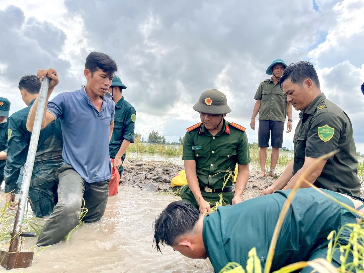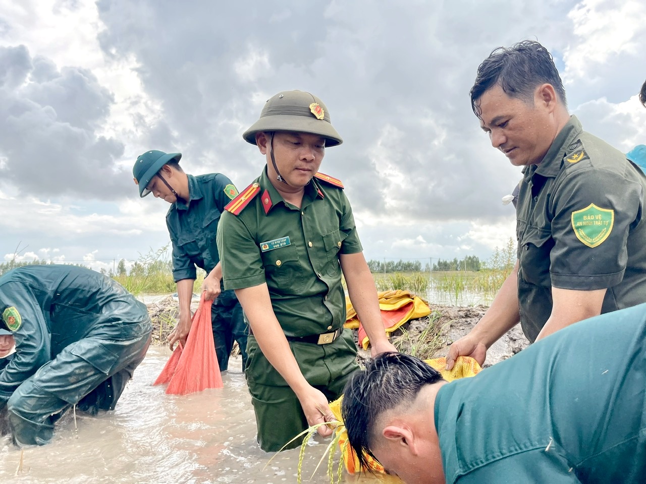 Trước diễn biến phức tạp của mưa lũ cuối mùa, những ngày qua mực nước tại tuyến đê bao lửng rọc Đuôi Chó thuộc ấp Bưng Ràm, xã Hưng Điền dâng cao đột ngột, gây nguy cơ tràn và vỡ đê, ảnh hưởng trực tiếp đến hàng chục hécta lúa vụ thu đông của nông dân. Với tinh thần vì nhân dân phục vụ, Công an xã Hưng Điền đã chủ động tham mưu UBND xã huy động lực lượng khẩn cấp gia cố tuyến đê, bảo vệ sản xuất và tài sản của Nhân dân.