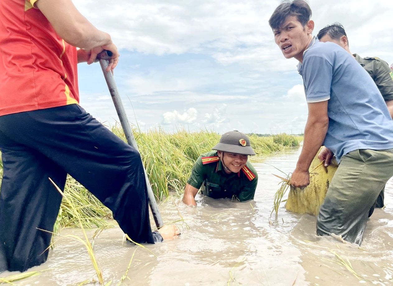 Công an xã Hưng Điền cùng nhân dân dầm mưa, vượt lũ, giữ mùa vàng