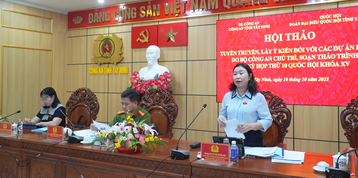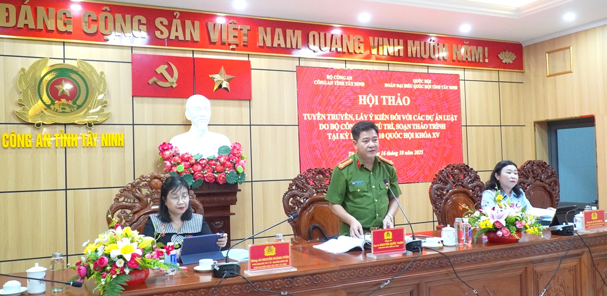 Chiều ngày 16/10/2025, Công an tỉnh Tây Ninh tổ chức Hội thảo tuyên truyền, lấy ý kiến đối với các dự án luật do Bộ Công an chủ trì soạn thảo trình Kỳ họp thứ 10, Quốc hội khóa XV. Đại tá Nguyễn Quốc Toàn - Phó Giám đốc Công an tỉnh dự và chủ trì Hội thảo.