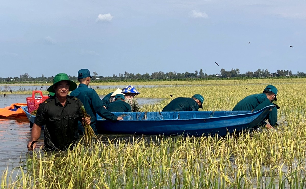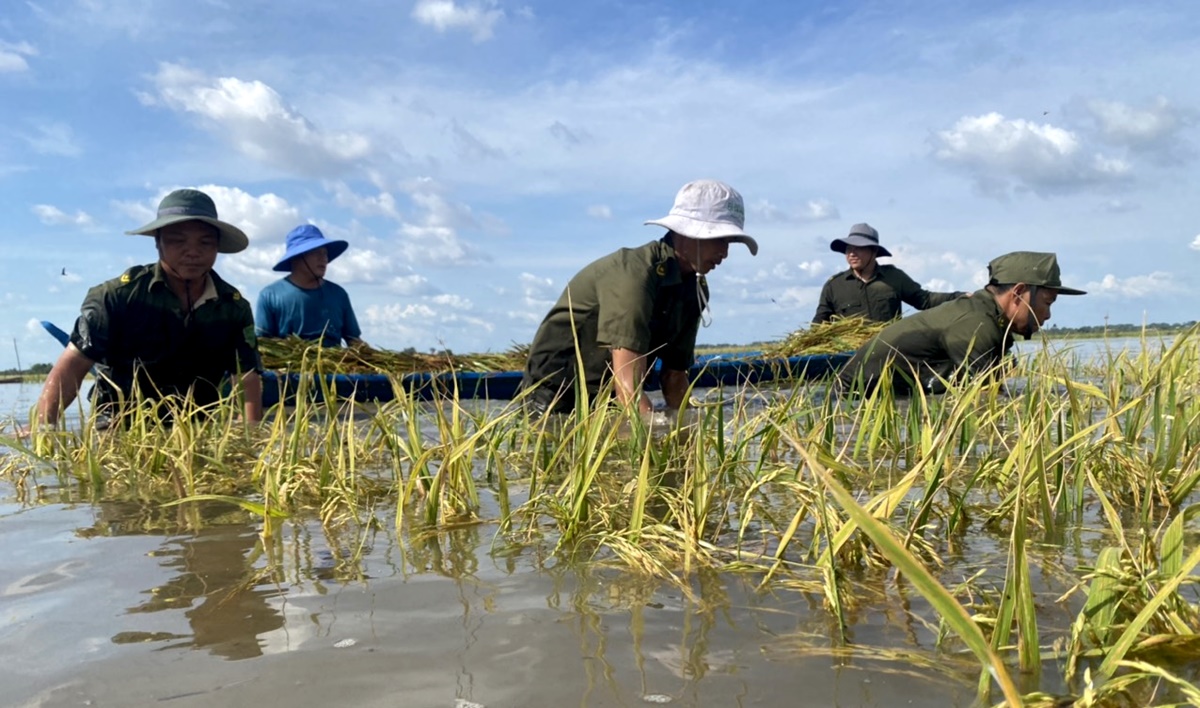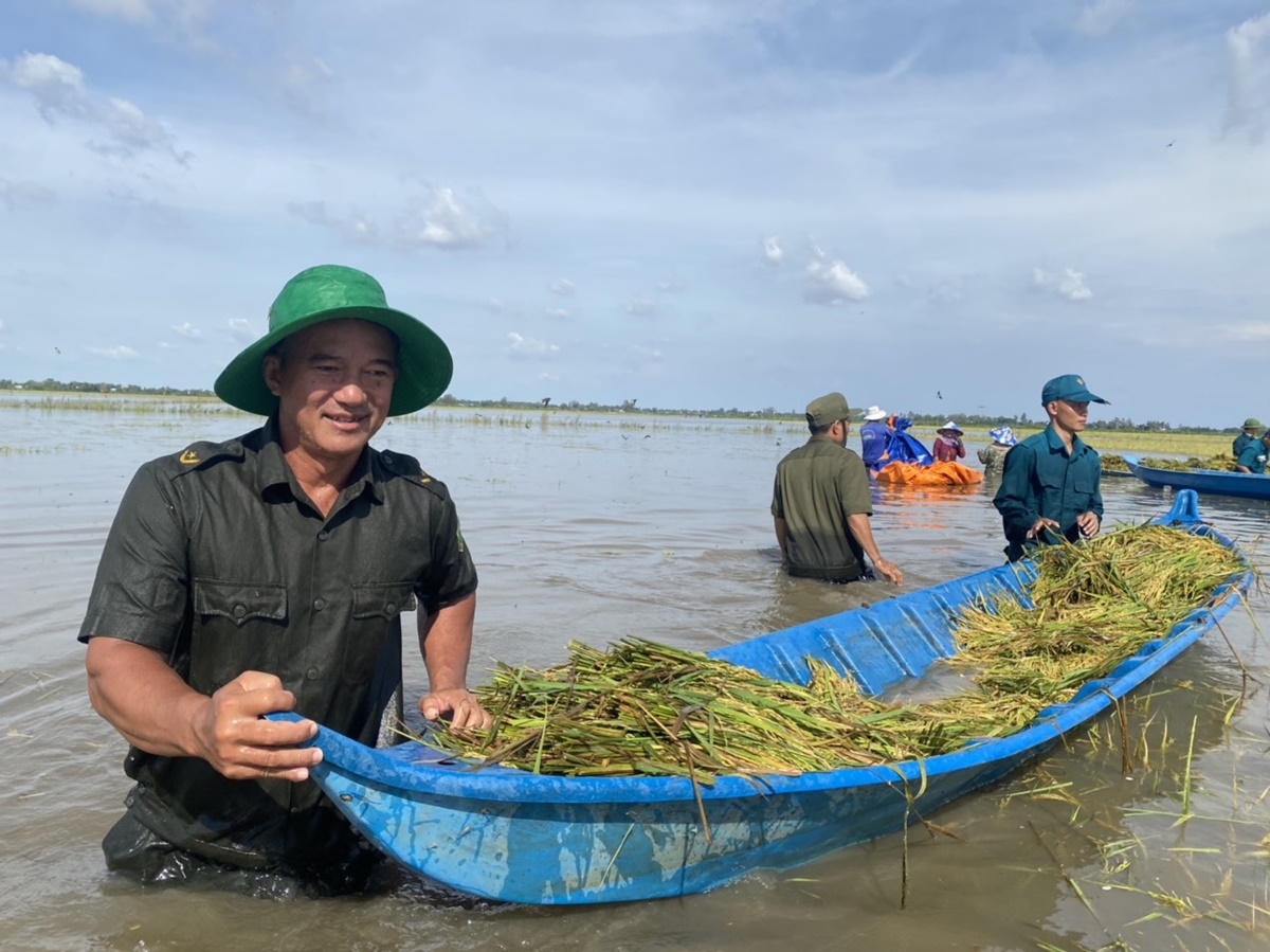 * Một số hình ảnh Công an xã Vĩnh Hưng giúp dân gặt lúa mùa nước nổi