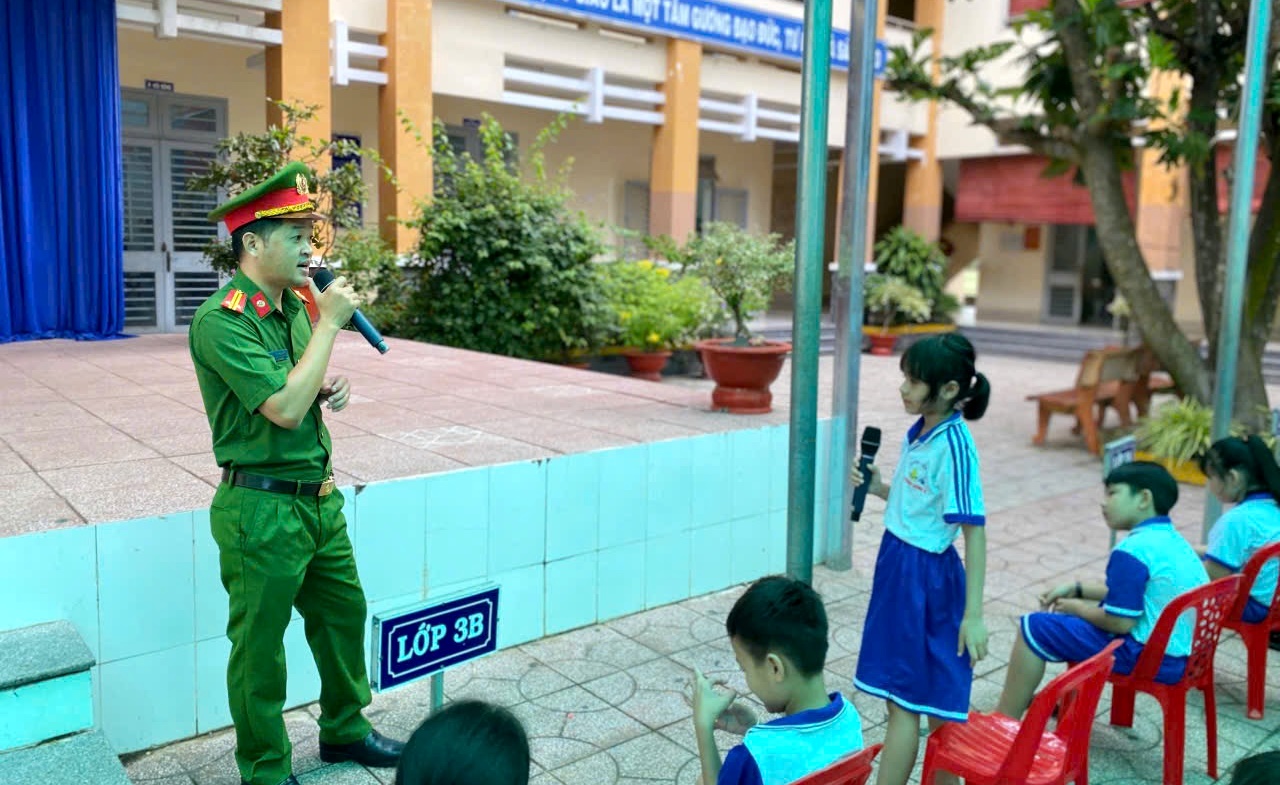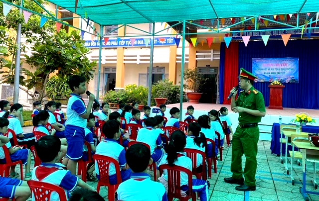 Công an xã Hậu Nghĩa tuyên truyền pháp luật về an toàn giao thông cho học sinh Trường Tiểu học Mai Văn Tựu