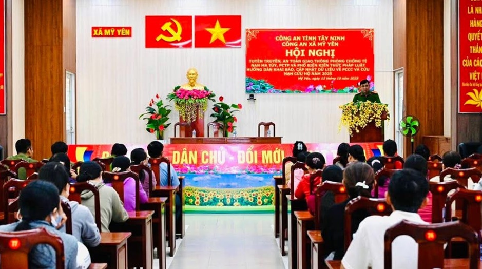 Công an xã Mỹ Yên tổ chức hội nghị tuyên truyền các quy định pháp luật về trật tự an toàn giao thông; phòng chống tệ nạn ma túy, tội phạm hình sự và Phòng cháy chữa cháy, cứu nạn cứu hộ cho khoảng 80 cơ sở kinh doanh lưu trú trên địa bàn xã.
