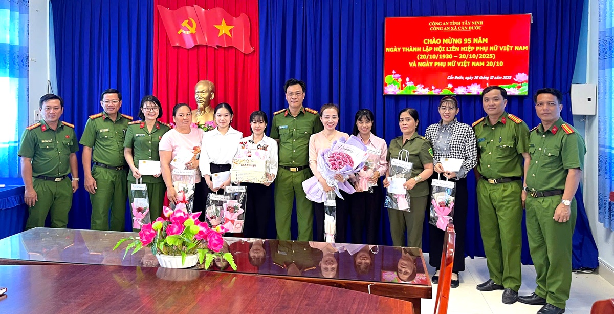 Công an xã Cần Đước tổ chức họp mặt chúc mừng và tặng quà đối với các chị em là cán bộ Công an xã, nhân viên nữ lao động hợp đồng, nữ lực lượng tham gia bảo vệ an ninh trật tự ở cơ sở trên địa bàn xã Cần Đước, nhân kỷ niệm 95 năm Ngày thành lập Hội Liên hiệp Phụ nữ Việt Nam và Ngày phụ nữ Việt Nam 20/10. Dự buổi gặp mặt có Trung tá Nguyễn Hoài Phong - Bí thư Chi bộ, Trưởng Công an xã.