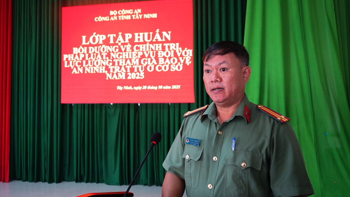 Công an tỉnh Tây Ninh tổ chức lớp tập huấn bồi dưỡng về chính trị, pháp luật, nghiệp vụ cho hơn 6.600 thành viên lực lượng tham gia bảo vệ an ninh, trật tự ở cơ sở năm 2025 trên địa bàn tỉnh.