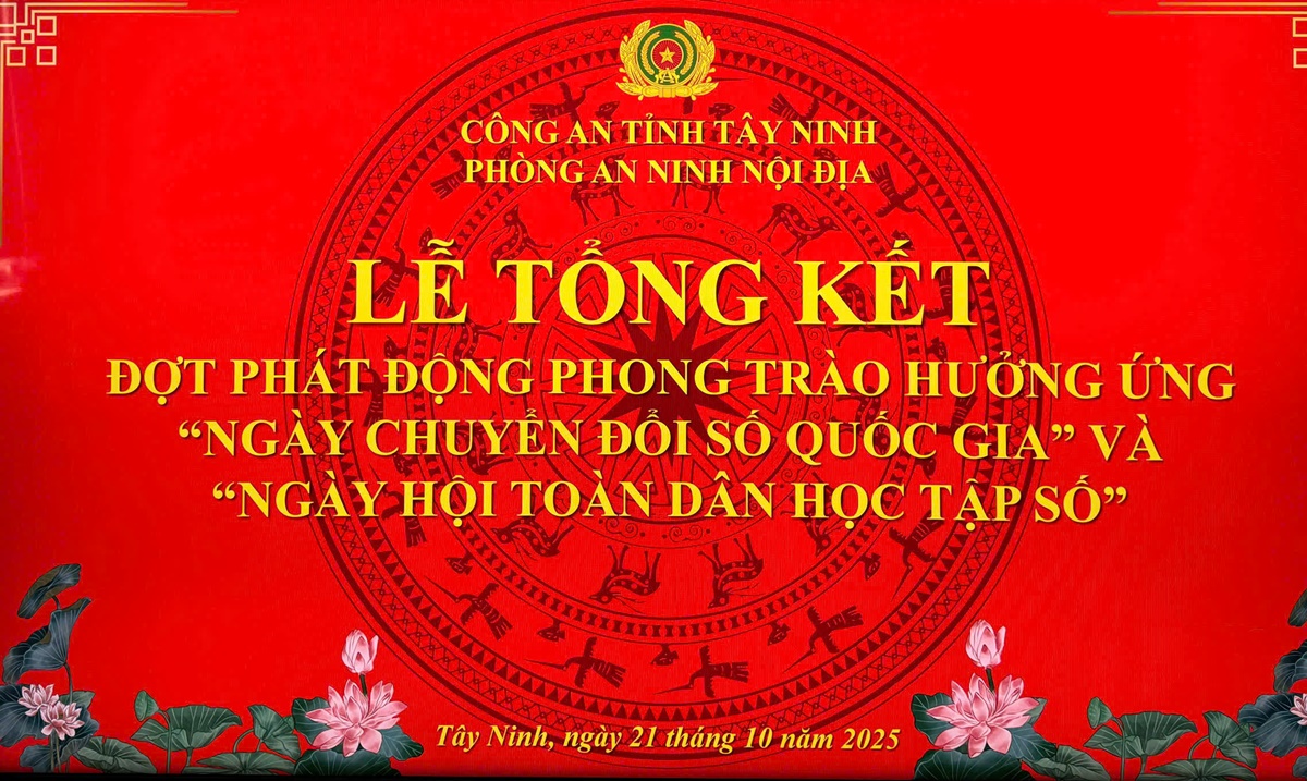 Ngày 21/10/2025, Phòng An ninh nội địa Công an tỉnh Tây Ninh tổ chức Lễ tổng kết đợt phát động phong trào hưởng ứng “Ngày chuyển đổi số quốc gia” và “Ngày hội toàn dân học tập số”. Thượng tá Nguyễn Thanh Sơn - Trưởng phòng chủ trì buổi Lễ.