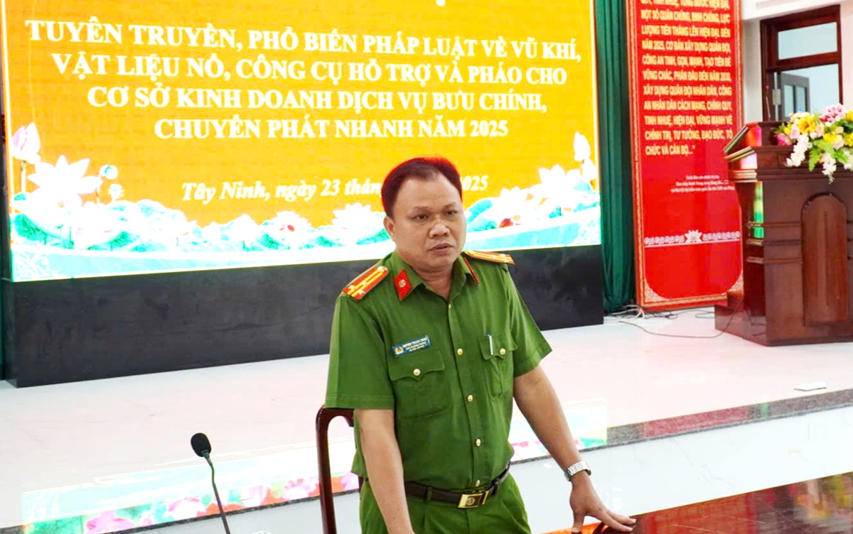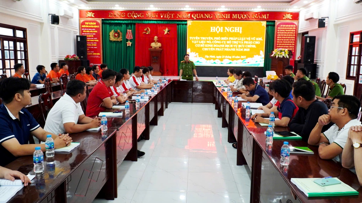 Sáng ngày 23/10/2025, Phòng Cảnh sát quản lý hành chính về trật tự xã hội Công an tỉnh Tây Ninh tổ chức Hội nghị tuyên truyền, phổ biến pháp luật về vũ khí, vật liệu nổ, công cụ hỗ trợ (VK, VLN, CCHT) và pháo cho cơ sở kinh doanh dịch vụ bưu chính, chuyển phát nhanh năm 2025.