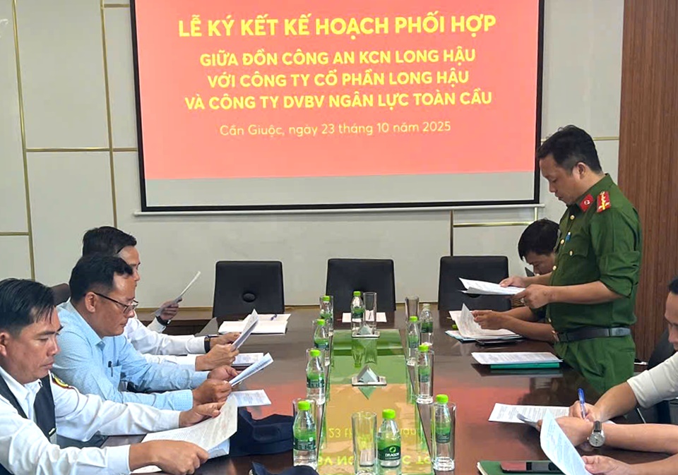 Sáng ngày 23/10/2025, Đồn Công an Khu Công nghiệp Long Hậu tổ chức ký kết công tác phối hợp trong công tác giữ gìn ANTT với công ty Cổ phần Long Hậu và công ty DVBV Ngân Lực Toàn Cầu thuộc Khu Công nghiệp Long Hậu (xã Cần Giuộc).