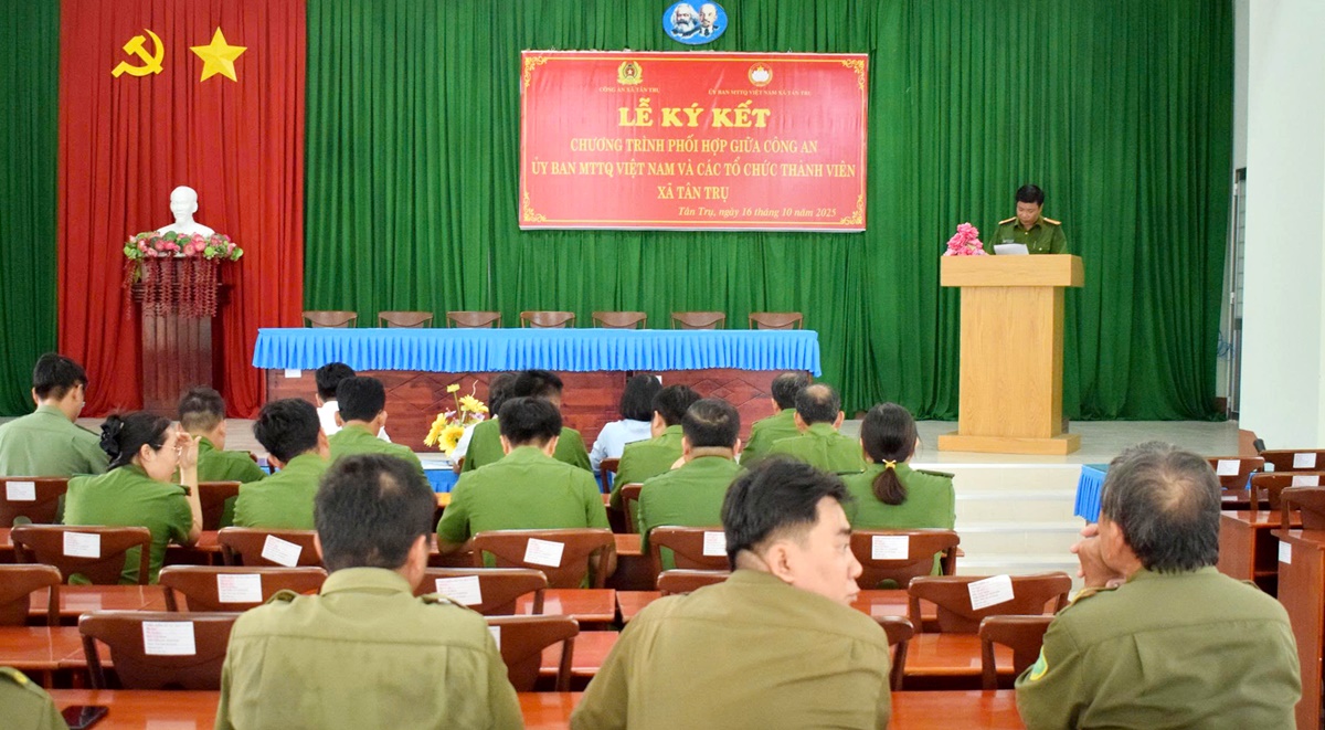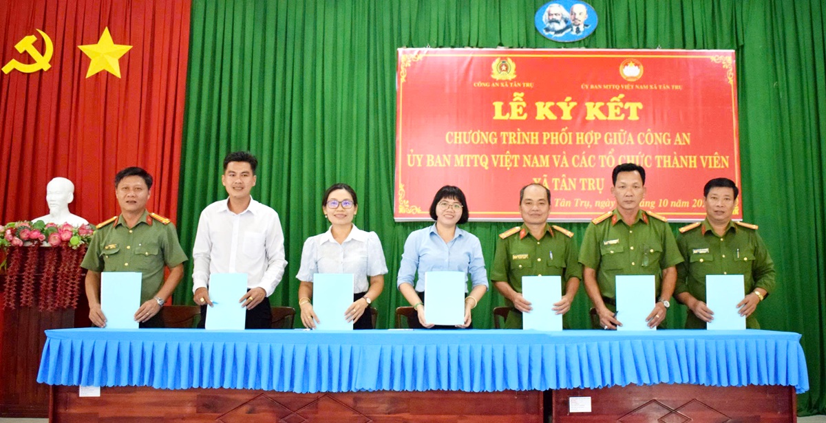 Công an xã Tân Trụ phối hợp với Ban Thường trực Ủy ban Mặt trận Tổ quốc Việt Nam xã và các tổ chức thành viên xã Tân Trụ vừa tổ chức lễ ký kết chương trình phối hợp “đẩy mạnh phong trào “Toàn dân bảo vệ an ninh Tổ quốc” trong tình hình mới.