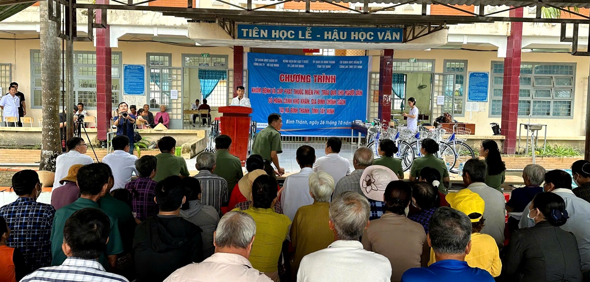 Cụ thể, mới đây, vào ngày 27/10/2025, Cơ quan Ủy ban Kiểm tra Đảng ủy Công an tỉnh Tây Ninh phối hợp với Cơ quan Ủy ban Kiểm tra Đảng ủy Công an Thành phố Hồ Chí Minh cùng với Bệnh viện Đại học Y dược Thành phố Hồ Chí Minh tổ chức chương trình khám bệnh, cấp phát thuốc miễn phí và tặng quà cho 500 hộ nghèo, gia đình chính sách trên địa bàn xã Bình Thành, tỉnh Tây Ninh. Tại đây, người dân được khám, tư vấn sức khỏe và nhận thuốc điều trị, góp phần chăm lo đời sống, sức khỏe cho nhân dân, thể hiện tinh thần nhân văn, trách nhiệm xã hội của cán bộ kiểm tra Đảng.