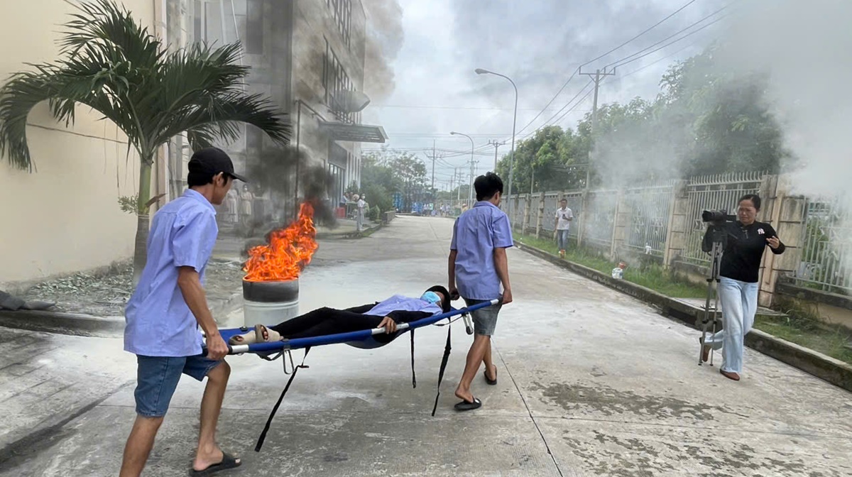 Tình huống giả định, vào lúc 10 giờ 45 phút xảy ra cháy tại khu vực để vải nguyên liệu bán thành phẩm tầng 1 nhà xưởng sản xuất, nguyên nhân cháy do sự cố điện. Hệ thống báo cháy và chữa cháy tự động đang trong thời gian bảo trì, không hoạt động đến khi đám cháy bùng phát mạnh, tỏa ra nhiều khói nhân viên mới phát hiện và tri hô báo cháy.