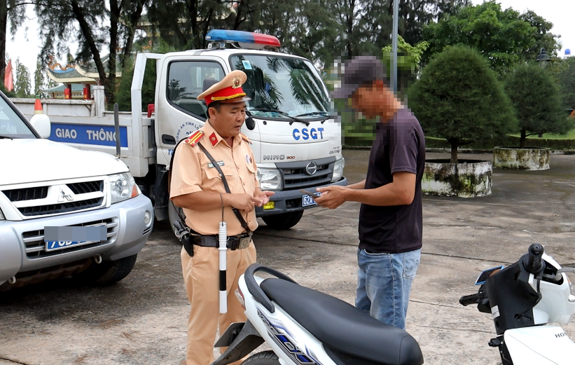 Cán bộ Đội Cảnh sát giao thông đường bộ số 3, Phòng Cảnh sát giao thông, Công an tỉnh Tây Ninh kiểm tra, xử lý người vi phạm không đội mũ bảo hiểm.