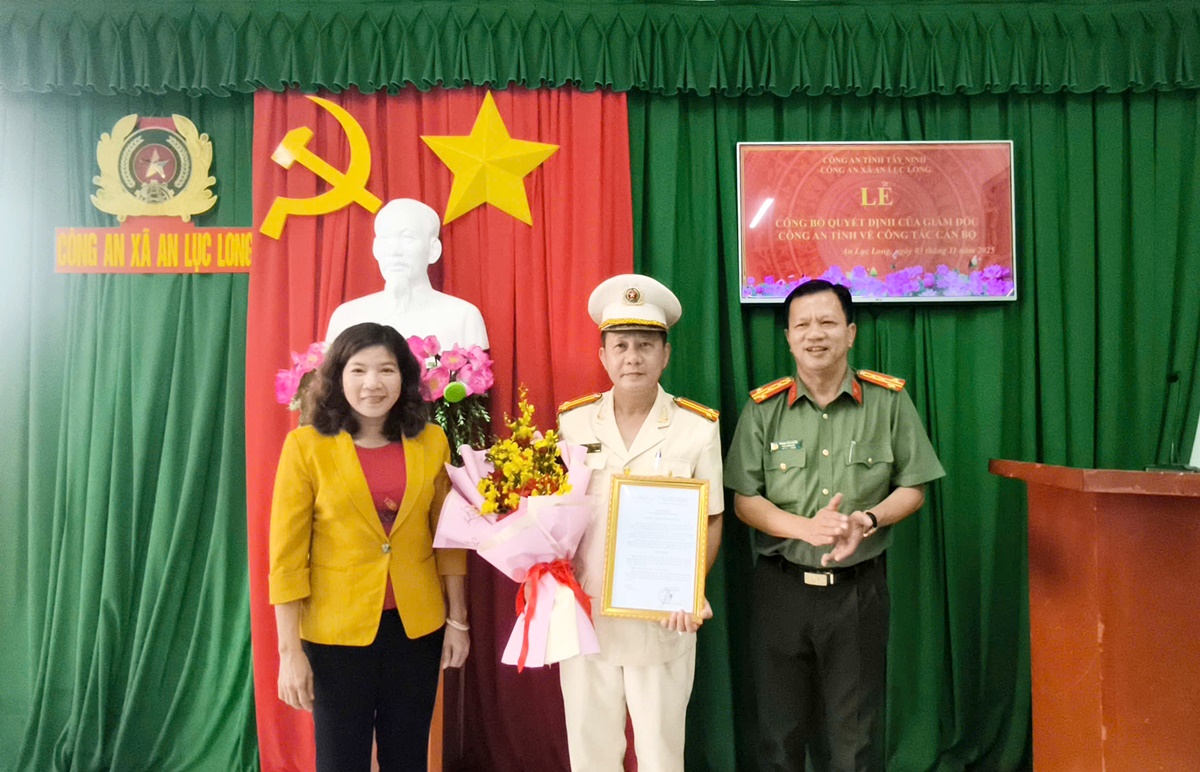 Ngày 03/11/2025, Công an xã An Lục Long, tỉnh Tây Ninh tổ chức Lễ công bố quyết định của Giám đốc Công an tỉnh về công tác cán bộ. Tham dự buổi lễ có Đại tá Phan Văn Triều - Phó Giám đốc Công an tỉnh, đồng chí Nguyễn Thị Út Thủy - Bí thư Đảng uỷ xã An Lục Long, đồng chí Hà Minh Tuấn - Chủ tịch UBND xã.