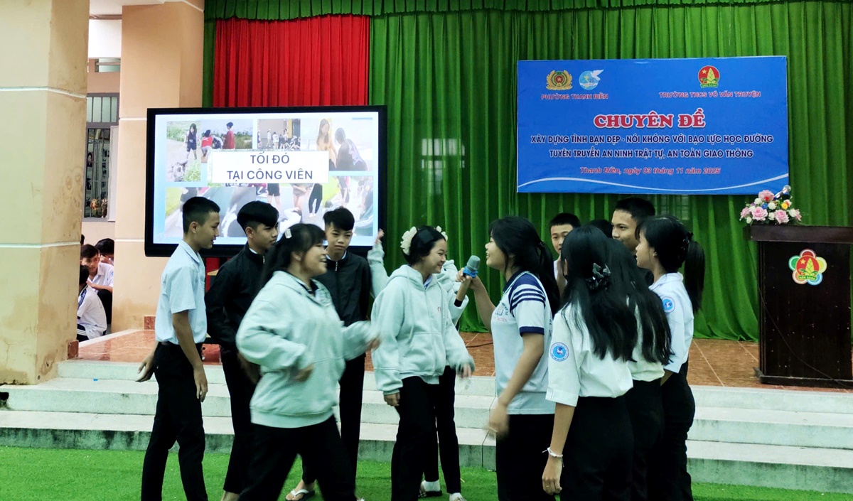 Ngày 03/11/2025, Công an phường Thanh Điền phối hợp Hội Liên hiệp Phụ nữ phường tổ chức buổi tuyên truyền với chuyên đề “Xây dựng tình bạn đẹp, nói không với bạo lực học đường” và tuyên truyền về an ninh trật tự, an toàn giao thông cho gần 1.000 em học sinh của trường THCS Võ Văn Truyện.