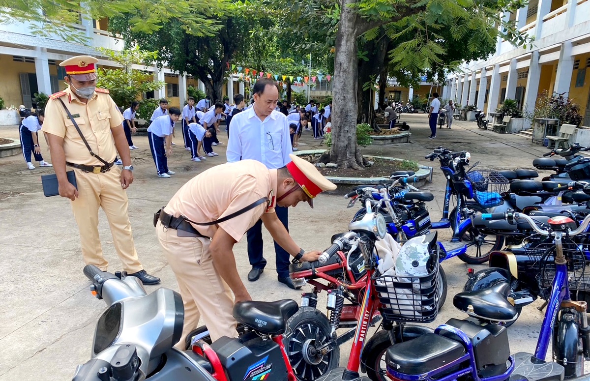 Cảnh sát giao thông Công an Tây Ninh kiểm tra các bãi giữ xe trong trường học.