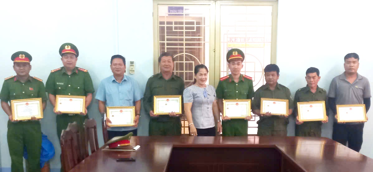 Đồng chí Trần Thị Bích Vân - Phó Chủ tịch UBND xã Thạnh Đức trao khen cho 8 cá nhân có thành tích trong truy bắt đối tượng cướp tài sản.