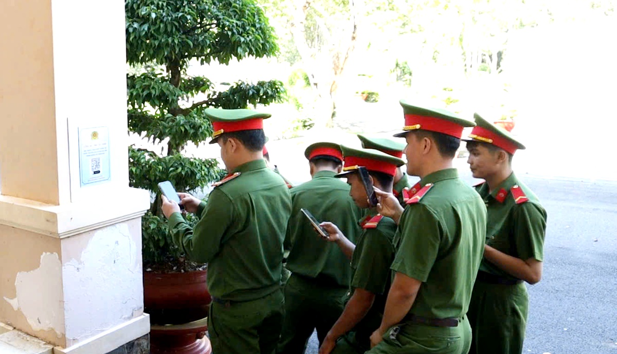 Cán bộ chiến sỹ quét mã QR tham gia Mô hình “Chuyển đổi số - Mã hóa và lắp đặt mã QR Code tại Ban An ninh Trung ương Cục miền Nam”.