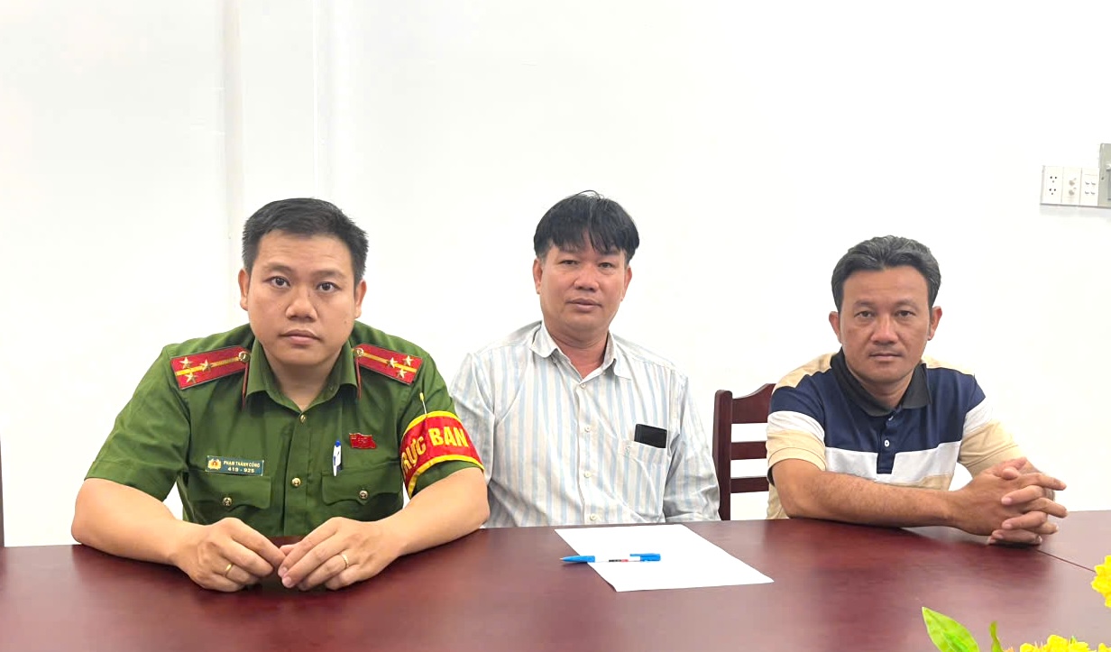 Anh Huy (ở giữa) gặp anh Hoàng cám ơn vì đã trả lại số tiền anh chuyển nhầm tại Công an xã Bình Thành.