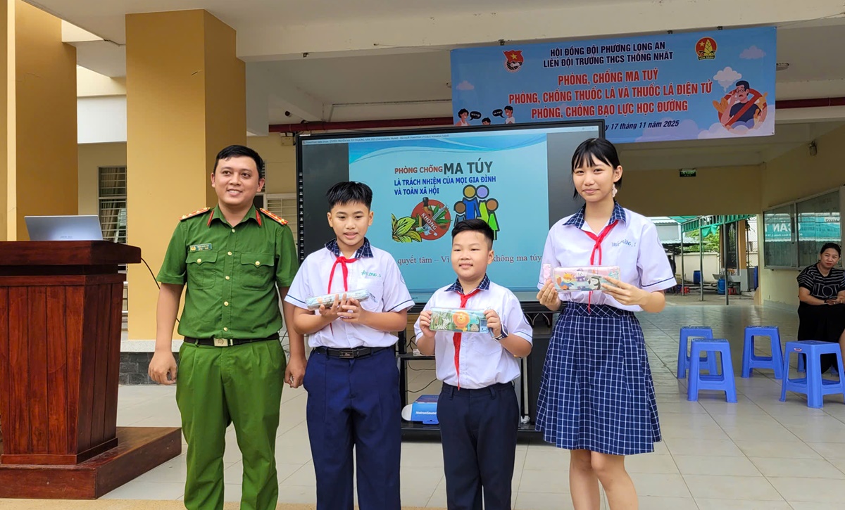Nhằm tăng cường nhận thức pháp luật và xây dựng môi trường học đường an toàn, lành mạnh, sáng ngày 17/11/2025, Chi đoàn Công an phường Long An đã phối hợp với Ban giám hiệu Trường THCS Thống Nhất tổ chức buổi tuyên truyền chuyên đề: “Phòng chống ma túy và bạo lực học đường” dành cho 1.180 học sinh khối 6 đến khối 9.