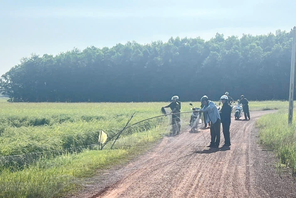 Công an xã Hảo Đước tuyên truyền cho người dân tháo gỡ, đốt bỏ các loại lưới bẩy chim trên cánh đồng.
