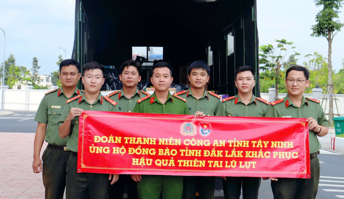 Đoàn viên thanh niên Công an tỉnh Tây Ninh tiếp nhận, vận chuyển hàng hóa ủng hộ người dân vùng lũ.