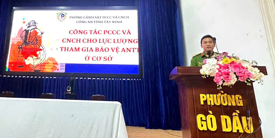 Ngày 27/11/2025, tại Hội trường UBND phường Gò Dầu, Đội Chữa cháy và cứu nạn, cứu hộ khu vực Gò Dầu, Phòng Cảnh sát phòng cháy chữa cháy, cứu nạn cứu hộ Công an tỉnh tham gia hỗ trợ huấn luyện, bồi dưỡng nghiệp vụ về phòng cháy chữa cháy, cứu nạn cứu hộ (PCCC và CNCH) cho gần 300 thành viên lực lượng tham gia bảo vệ An ninh trật tự cơ sở trên địa bàn phường Gò Dầu, xã Phước Thạnh và xã Thạnh Đức.