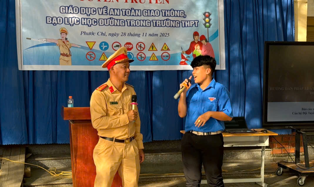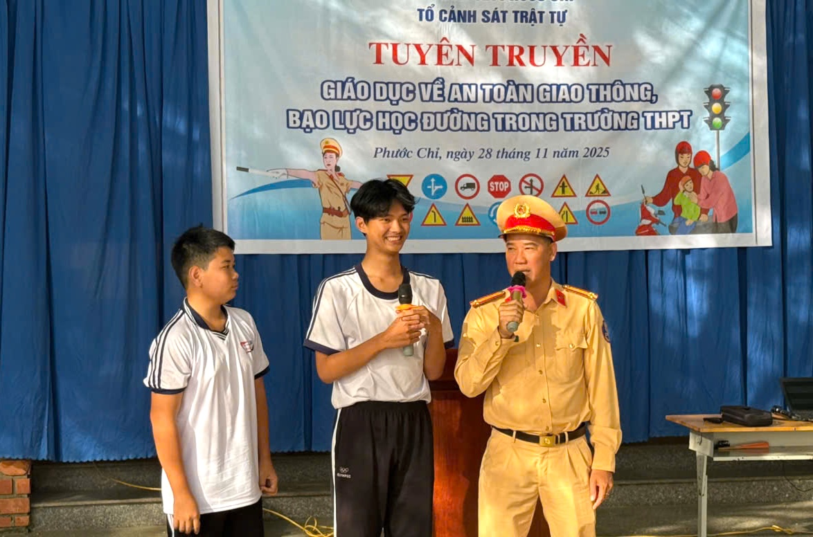 Ngày 28/11, Phòng Cảnh sát giao thông Công an tỉnh Tây Ninh phối hợp với Công an xã Phước Chỉ tổ chức tuyên truyền pháp luật về trật tự an toàn giao thông và phòng, chống các loại tội phạm cho 750 em học sinh trường THPT Bình Thạnh (xã Phước Chỉ, tỉnh Tây Ninh).