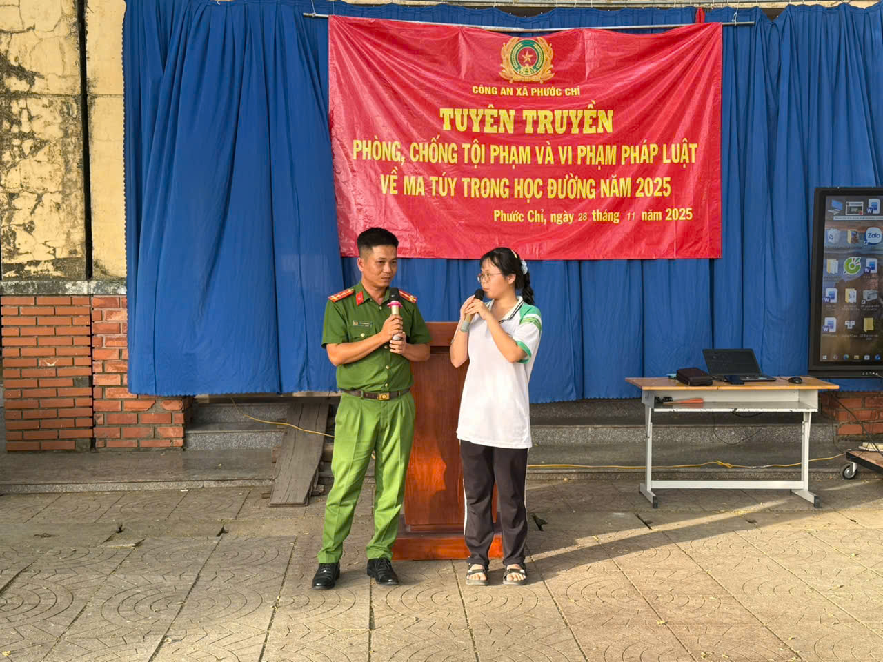 Ngoài ra, các em học sinh còn được cán bộ Công an xã Phước Chỉ tuyên truyền, cảnh báo về những loại ma túy và tác hại của ma tuý đối với người sử dụng, gia đình và xã hội; phổ biến quy định của pháp luật về các hành vi vi phạm liên quan đến ma tuý. Cán bộ Công an cũng đã phổ biến cho học sinh về phương thức, thủ đoạn của tội phạm lừa đảo trên không gian mạng, tội phạm mua bán người cũng như cách thức phòng, chống bạo lực trong học đường.