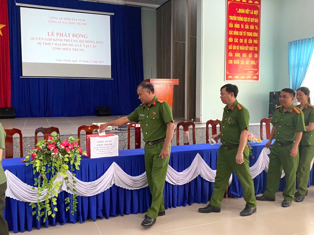Nhằm phát huy truyền thống “tương thân tương ái”, “lá lành đùm lá rách” của dân tộc, sáng ngày 01/12/2025, Công an xã Châu Thành đã tổ chức Lễ phát động ủng hộ đồng bào bị thiệt hại do mưa lũ. Lễ phát động diễn ra trong không khí trang nghiêm, đoàn kết, với sự tham dự của toàn thể cán bộ, chiến sĩ Công an xã Châu Thành.