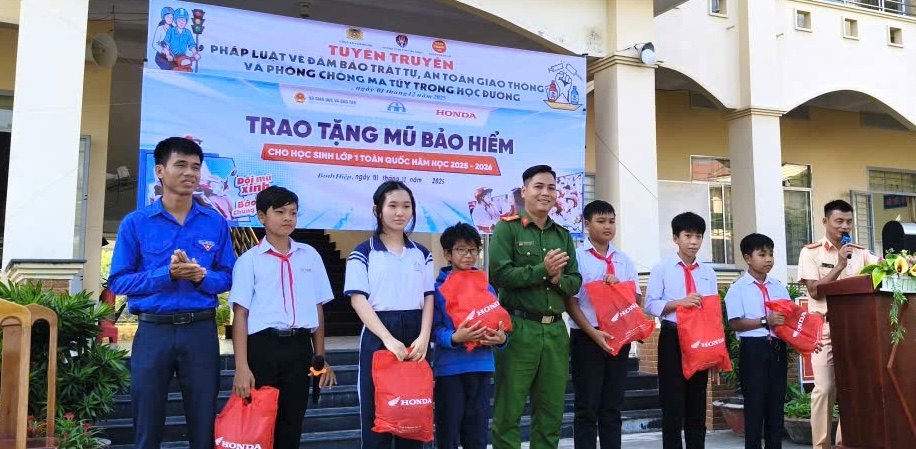 Nhân dịp này, Công an xã và các đơn vị phối hợp đã trao tặng 40 phần quà là mũ bảo hiểm cho các em học sinh của nhà trường, nhằm khuyến khích các em thực hiện nghiêm việc đội mũ bảo hiểm khi tham gia giao thông, bảo vệ bản thân và người thân.