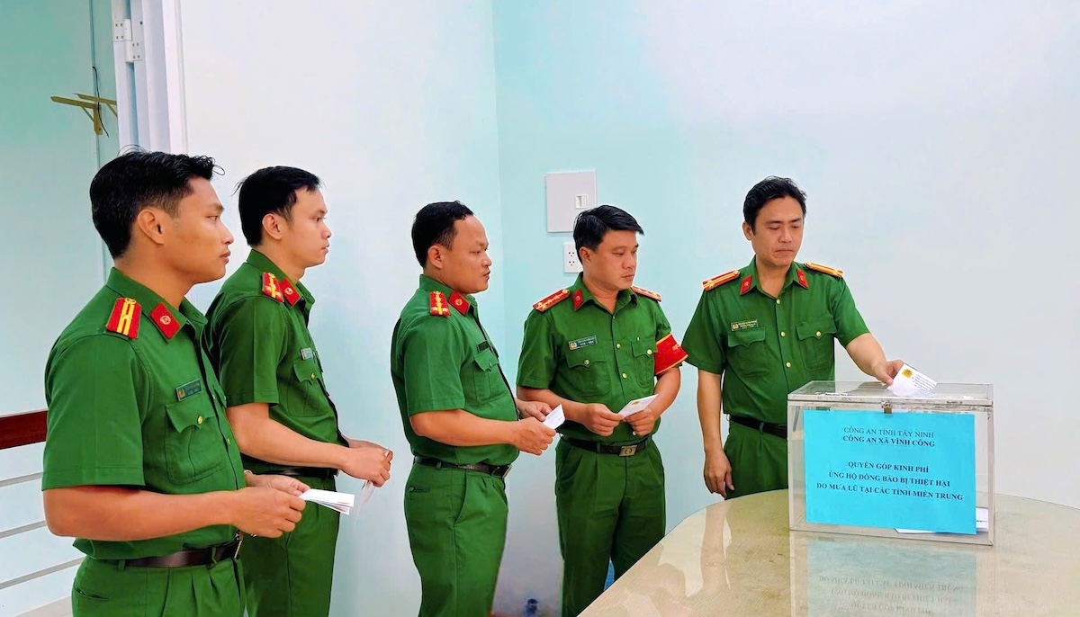 Phát huy truyền thống tốt đẹp của lực lượng Công an nhân dân với tinh thần “Tương thân tương ái, lá lành đùm lá rách, vì Nhân dân phục vụ”, toàn thể cán bộ, chiến sỹ Công an xã Vĩnh Công đã tích cực tham gia, tự nguyện đóng góp kinh phí để hỗ trợ và chia sẻ khó khăn cùng nhân dân miền Trung.